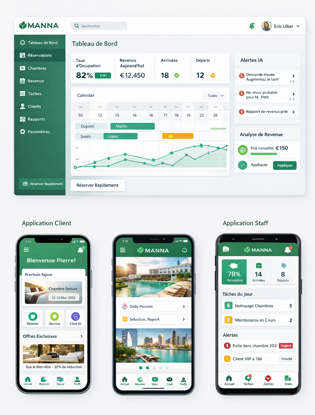 MANNA est une plateforme SaaS tout-en-un pour les hôtels, resorts et chaînes hôtelières, intégrant :